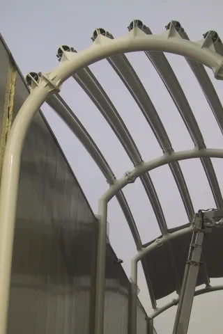 Il manicotto è un edificio di raccordo, come un soffietto fuori scala, ed è stato realizzato con tubi calandrati rivestiti di una guaina nera che, dall’esterno, richiama gli elastici biassiali delle tute in pelle Dainese. Ha due grandi finestre ovali, simili a occhi, e il suo interno è totalmente bianco. Richiama alla mente l’idea di un ventre protettivo o la cassa toracica di un animale gigantesco.
