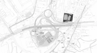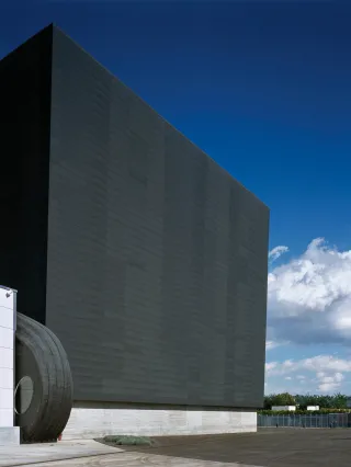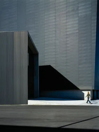 Nato come semplice spazio tecnico, ha ben presto assunto un ruolo di front-building. La struttura interna è un’enorme griglia tridimensionale in metallo: il corpo di questa “macchina” è un parallelepipedo con spigoli vivi, enfatizzati dalla strombatura del volume. I pannelli di zinco titanio ossidato nero compongono una finitura nera, muta, neutrale. Il basamento in cemento sbrecciato evoca le caratteristiche del legno per mettere in evidenza la solidità delle radici.