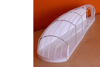 La pianta e le aperture laterali dello showroom multifunzionale ricordano il profilo e le branchie di un armadillo, grazie anche all’andamento ondulato del rivestimento in zinco titanio. Altre fonti di luce, all’interno, sono i lucernai, variamente orientati affinché il sole entri in ogni stagione, diffondendo così una luce zenitale e piacevole. Gli arredi espositivi formano l’ossatura del luogo, presentandosi come una sorta di spina dorsale.