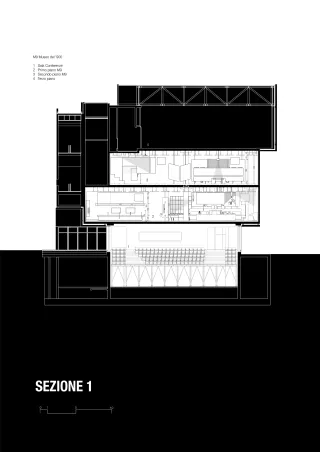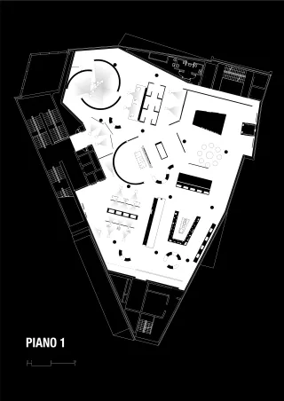 Le sue sale – grandi spazi neri dalla forma poligonale – si sviluppano su due piani e ospitano otto sezioni tematiche.